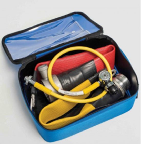 充氣管道救援套組的設計和開發(fā)旨在提供一種簡單而有效的方式,使用標準長度的消防水帶提供下游安全吊臂或浮動救援輔助設備。充氣管道救援套組充氣系統(tǒng)可使消防水帶兩端密封,尾部帶2個密封件,公頭末端為黃色,以便清晰識別并在使用時增加可視性。該系統(tǒng)的工作壓力為1.5巴,并使用系統(tǒng)提供的充氣套件進行充氣,該系統(tǒng)配有預設3.5巴的壓力調節(jié)器。母頭的尾巴