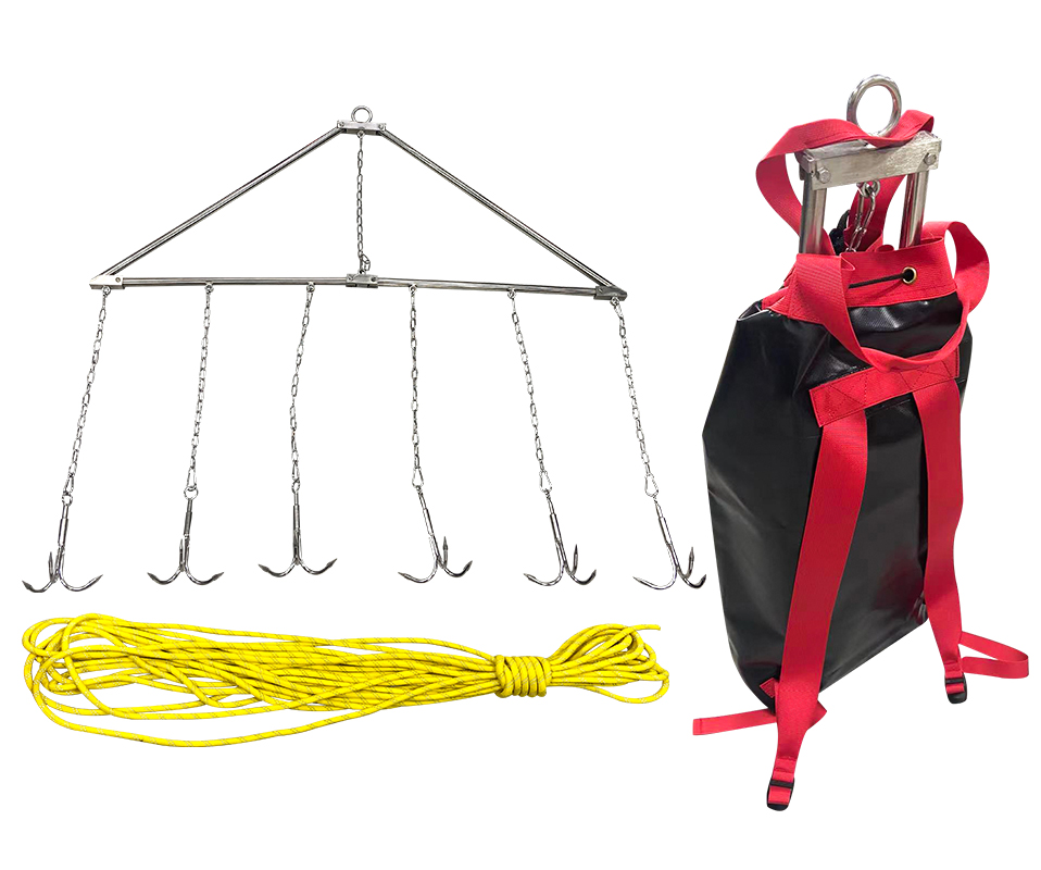 滾鉤整體為不銹鋼材質(zhì),鉤體采用三爪錨鉤,用于水下搜索溺水人員。整體三角可拆卸式,三角架經(jīng)過靜載荷性能測(cè)試:承重220KG。材質(zhì):304不銹鋼材質(zhì);一套滾鉤24 枚, 鉤體:為三爪倒鉤形式,鉤體粗3mm、長度100mm,鉤與鉤間距15cm;主繩:長1500mm,直徑12mm。