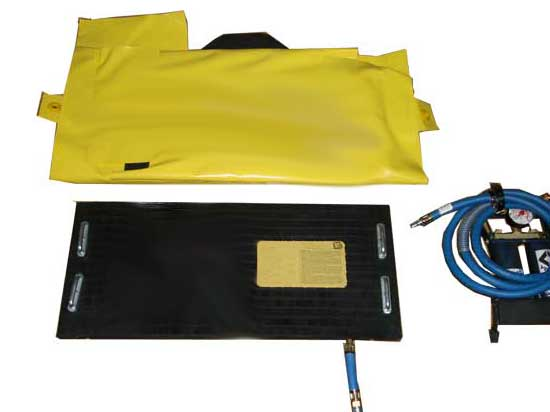 2種規(guī)格(旋轉扣型,重量25kg,帶子導向扣型,重量16.9kg),密封面積50×30厘米,軟橡膠材質,配有快速充泄氣切換接口,1個帶安全壓力表的腳踏高壓氣泵。適用于在地形復雜的狹窄空間內(nèi)密封直徑在5至48厘米的管道及圓形容器的裂縫。